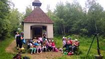Ve čtvrtek jsme zdolali křížovou cestou Hladový vrch, kde jsme se u kapličky posilnili, abychom nebyli hladoví i my. U hotelu Belveder jsme objevili hřiště, kde jsme si pohráli. Cestou zpět nás v lese překvapil vzkaz od skřítka Samotníčka, který nám pomohl vypátrat poklad ukrytý pod okřínkem (vývratem).