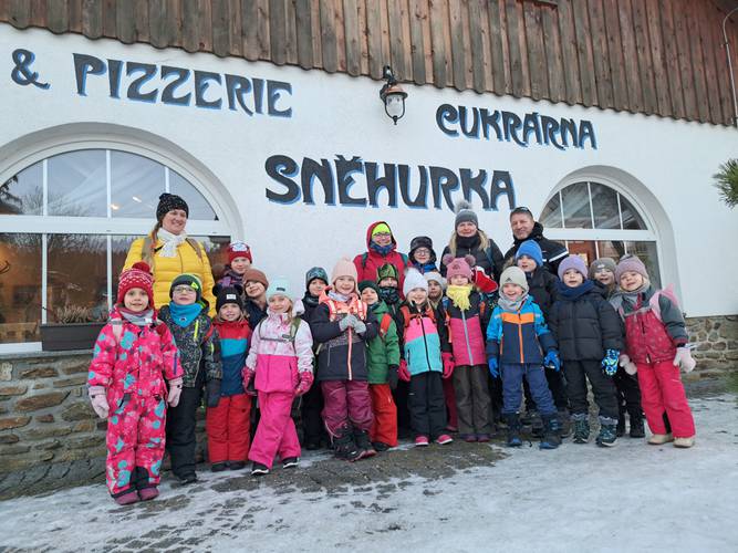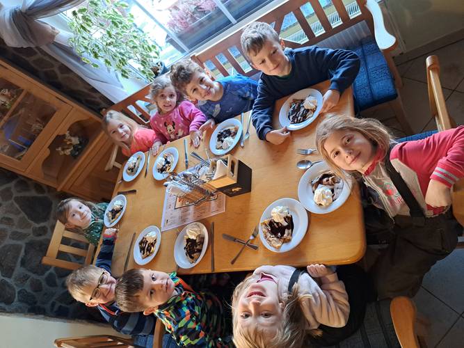 Poslední den na horách jsme rozhodně nebrali na lehkou váhu. Hned ráno jsme se ještě vydali na sníh a děti si ho užily opravdu naplno. Poslední koulovačky, válení ve sněhu, smích a společné dovádění byly krásnou tečkou za zimním pobytem. Odpoledne nás čekala slíbená procházka do cukrárny. Sladká odměna v podobě palačinek byla přivítána s obrovským nadšením a podle výrazů dětí bylo jasné, že chutnaly opravdu všem.